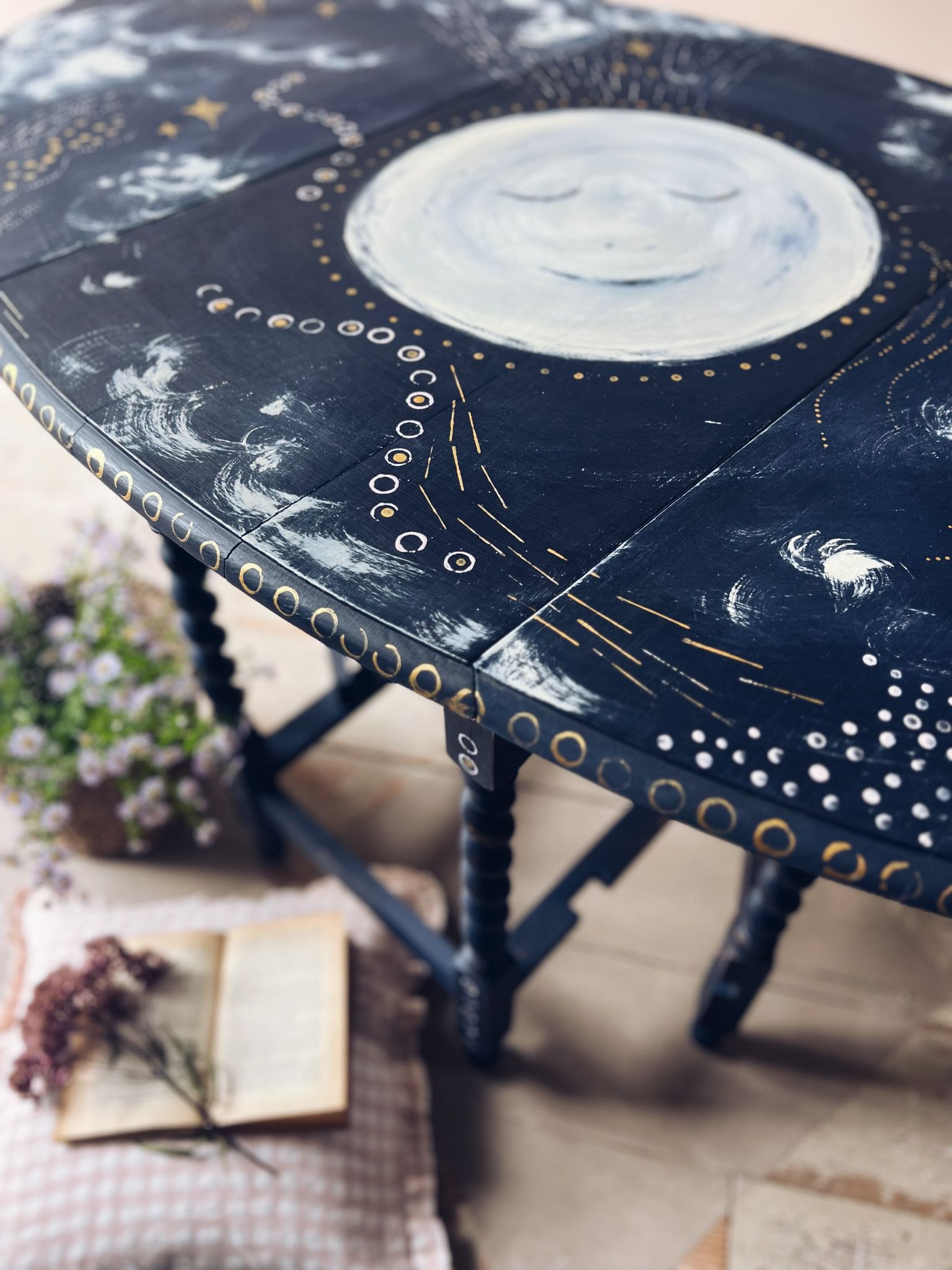 - Artwork: The tabletop is meticulously hand-painted with a night sky scene, capturing the mystical allure of Andersen's fairy tales. The design includes celestial motifs set against a deep, midnight blue background.