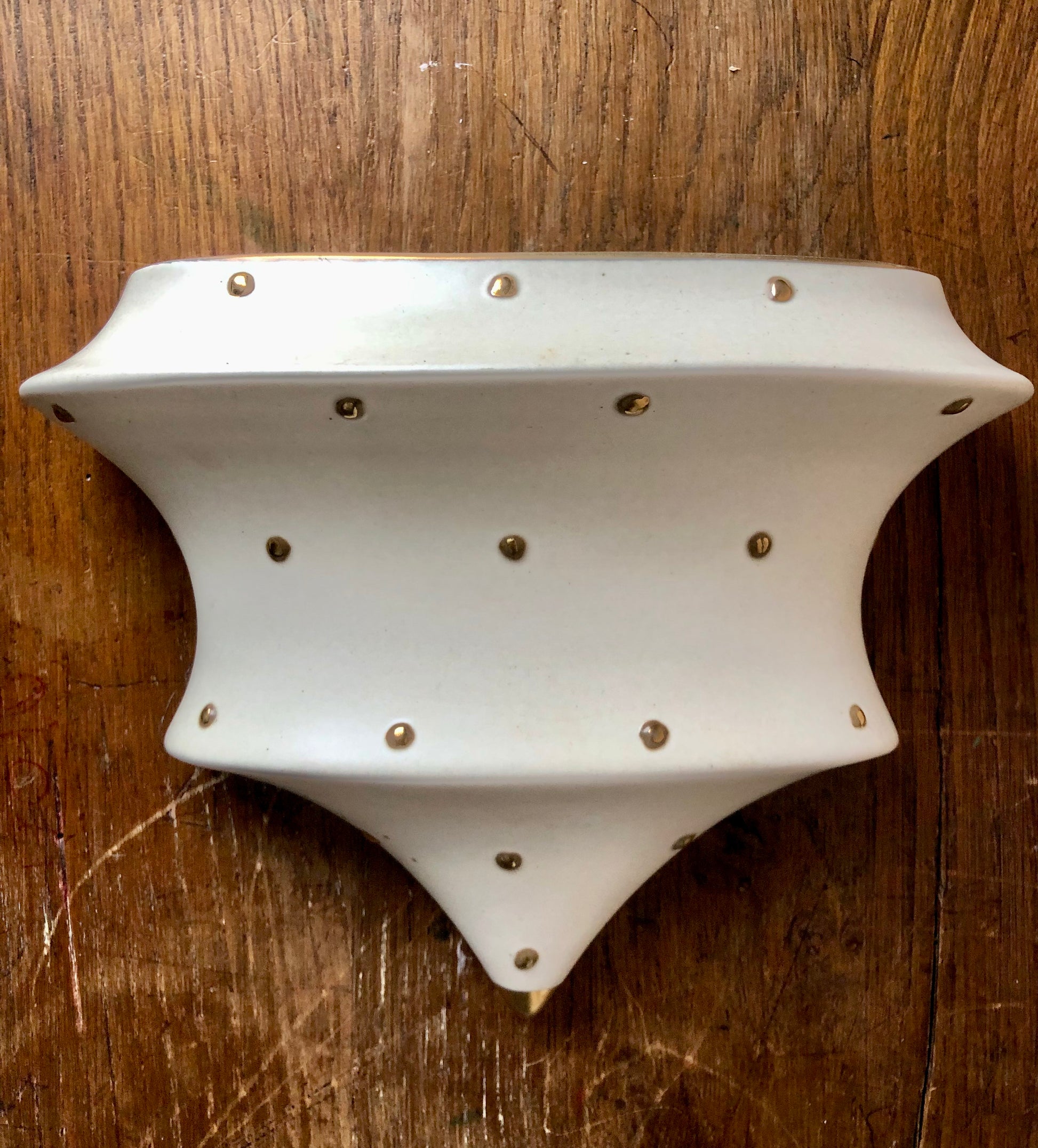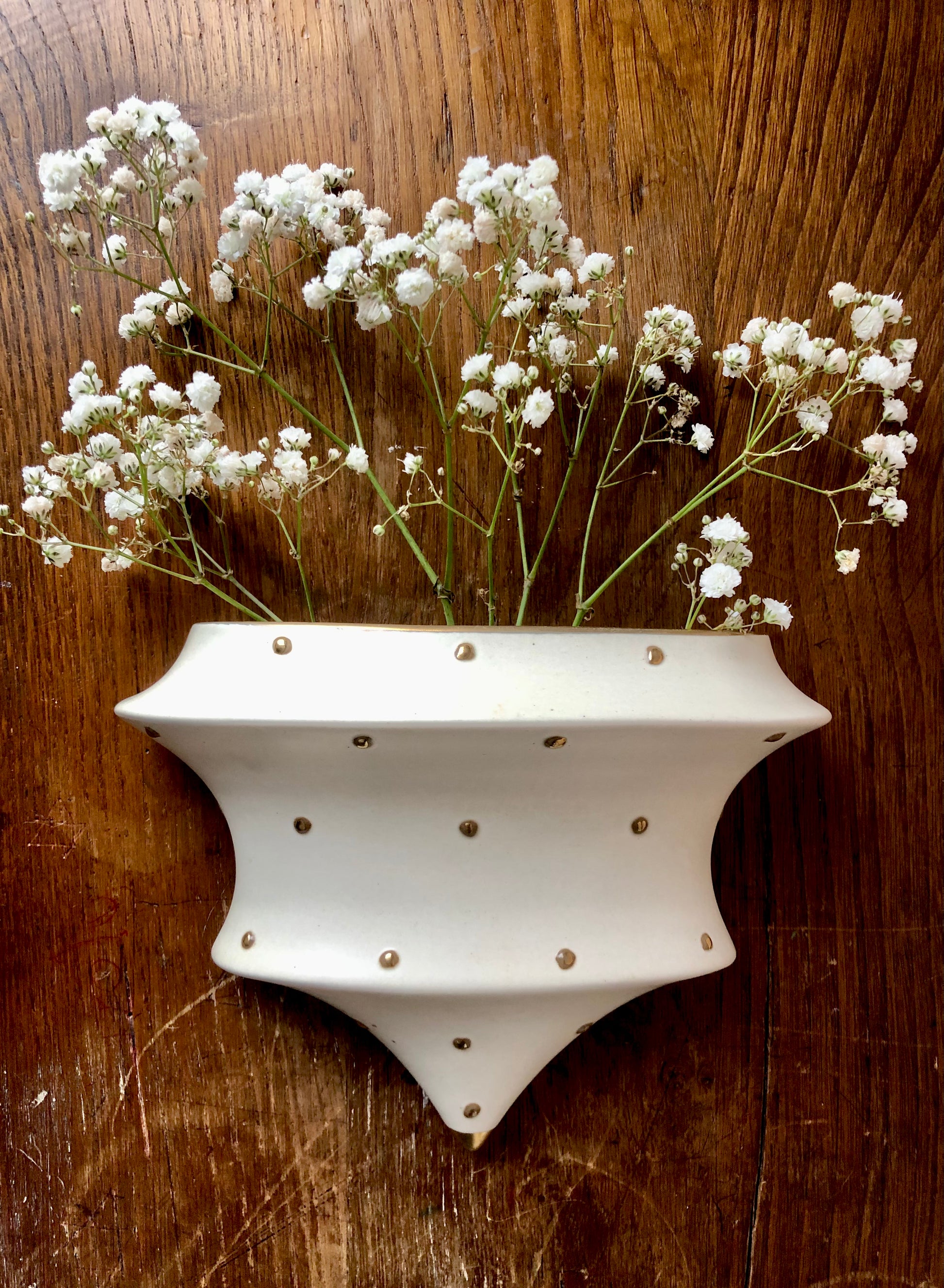 Rare vintage wall pocket vase, designed by the celebrated British ceramic artist Charlotte Rhead. Crafted by Bursley Ware in England, this piece showcases the Art Deco aesthetic with a sleek ivory glaze accented by gilded studs for a sophisticated, minimalist look.