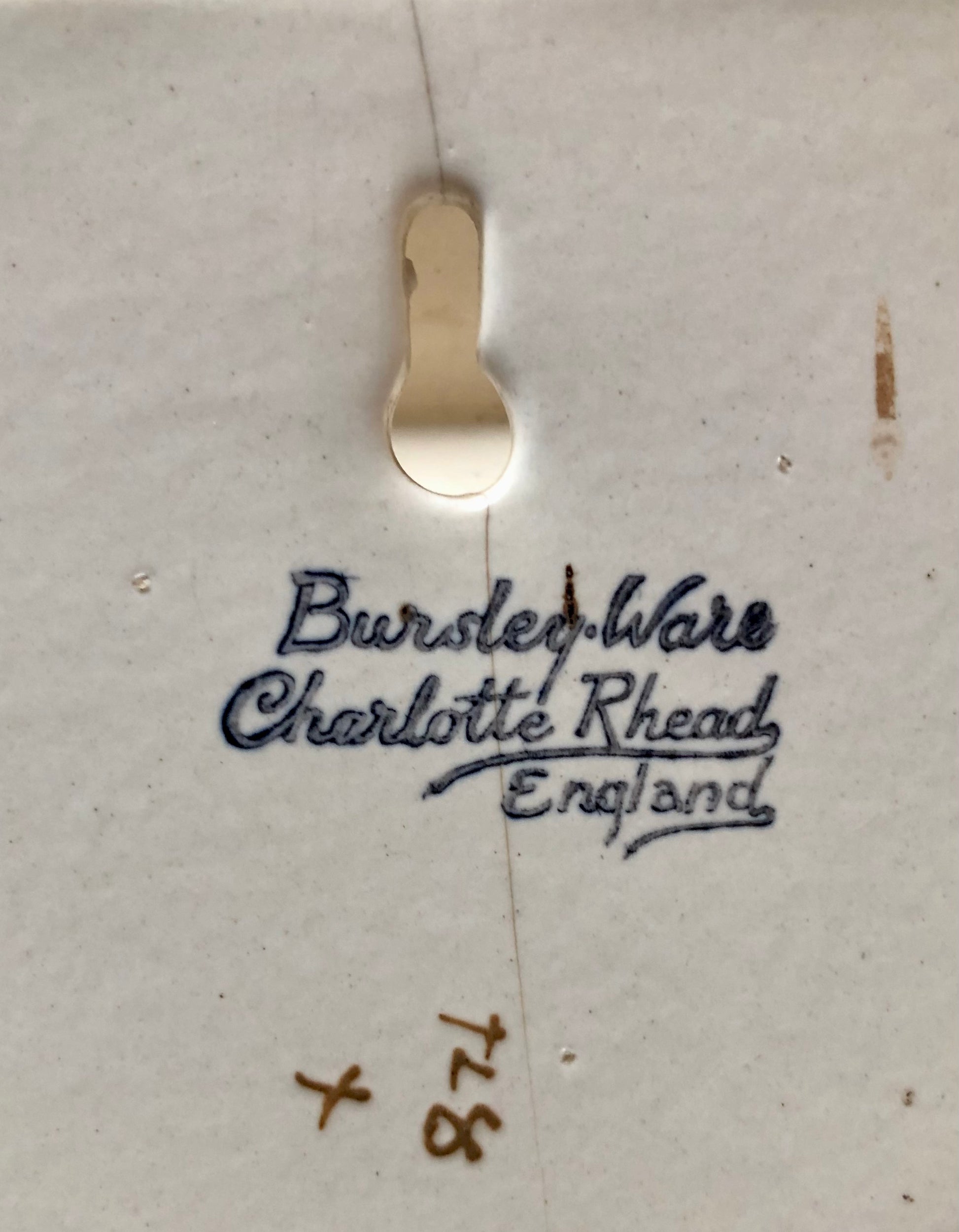 The base is stamped with the iconic Bursley Ware backstamp, featuring Charlotte Rhead’s signature, affirming its authenticity and collectible value. Hand-painted detailing, including the pattern number “728,” adds a personal touch and showcases the fine craftsmanship of the era.