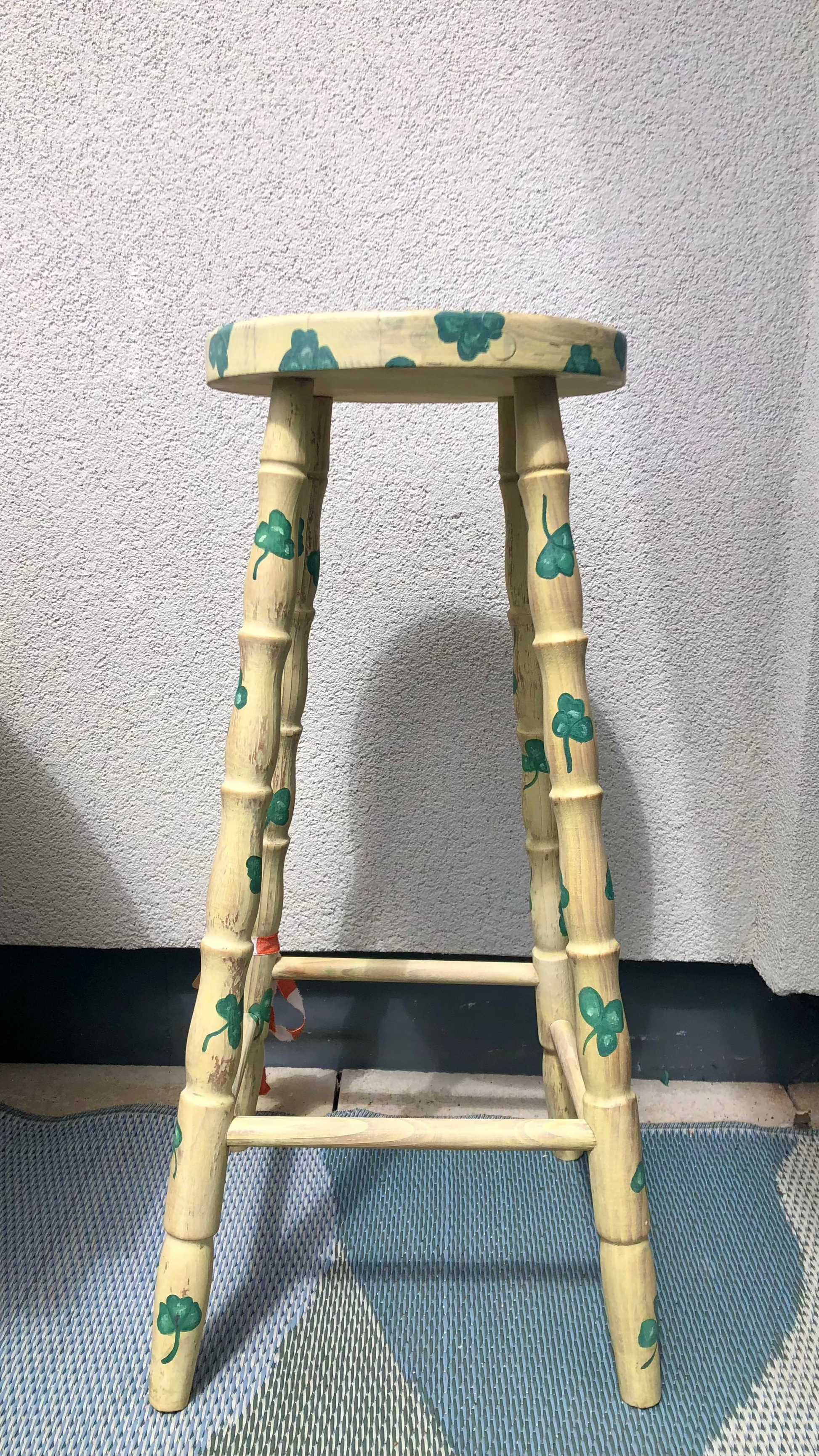 Upcycled stool painted using Annie Sloan Chalk Paint in a rustic, playful style. All over hand painted three leaf clover/ shamrock design. All 4 sides are shown in the photos. There is a four leaf lucky clover on one of the legs. Sealed with wax.