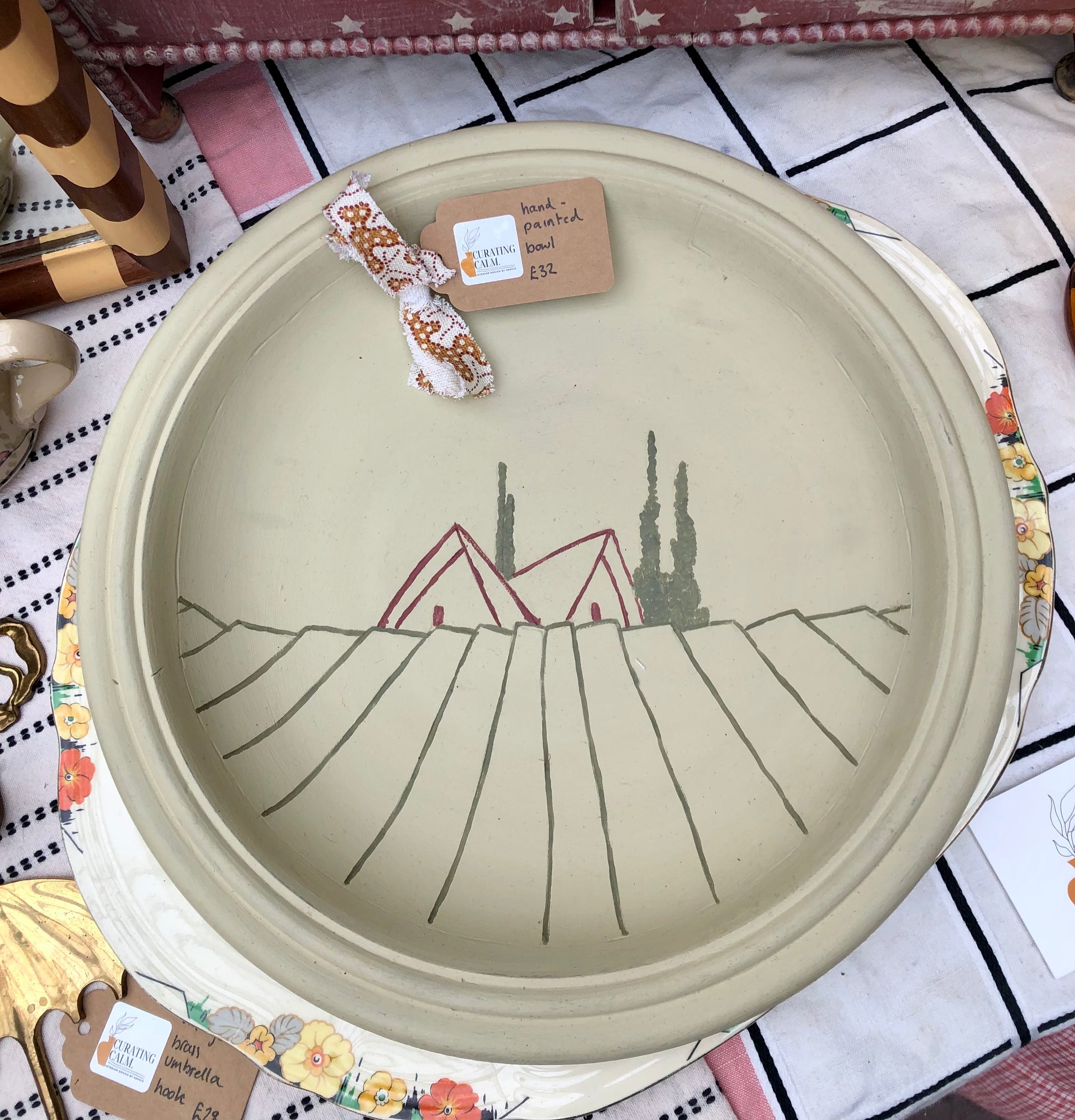 Wooden bowl hand-painted with chalk paint and sealed with clear wax. Intended as a decorative item, would make a lovely wall plate. Clean with a damp cloth.
