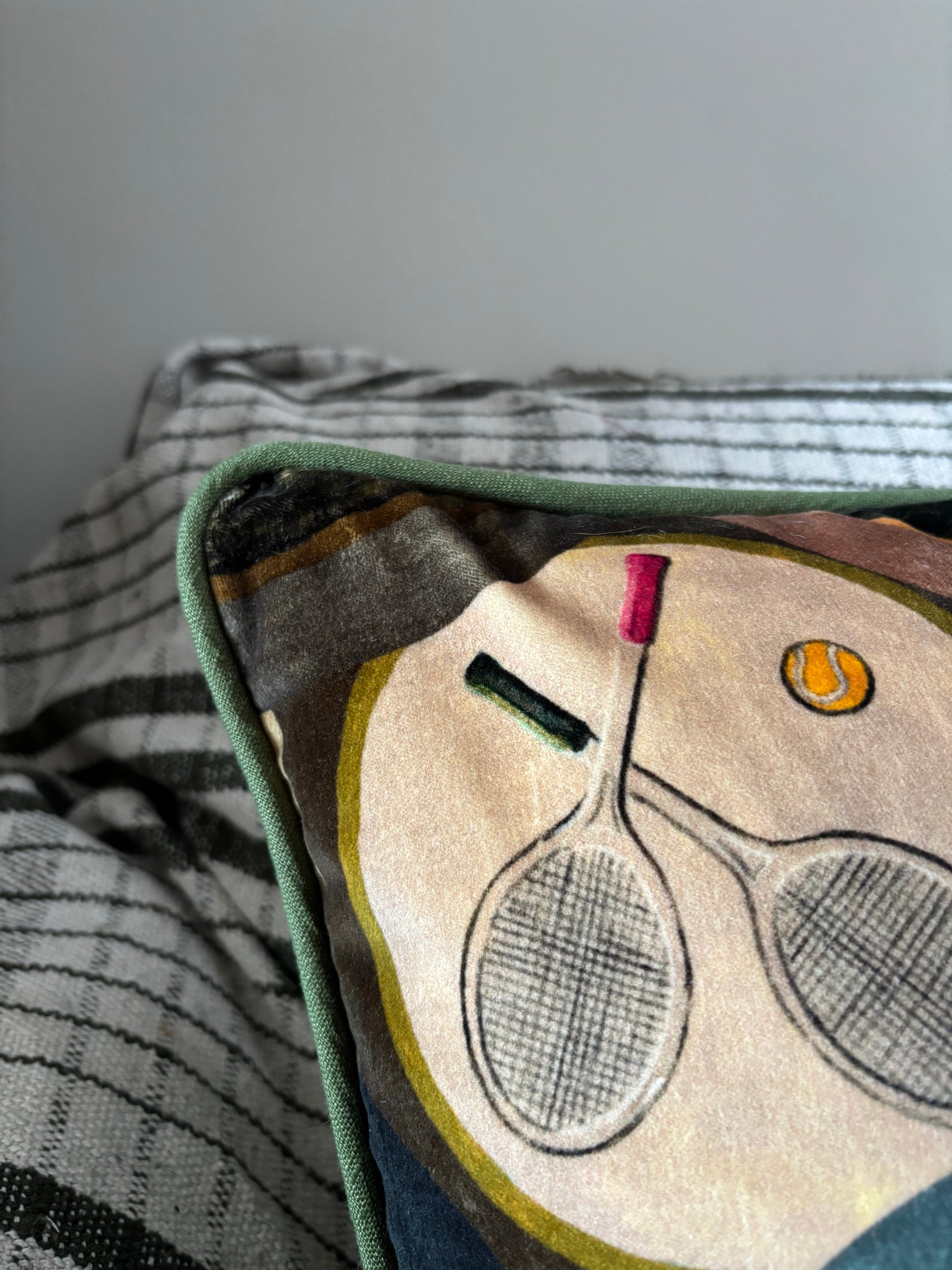 40 x 40cm cushion handmade from deadstock Mulberry cotton velvet in "Sporting Life" design. Pea green piping and back, zip to underside. UK duck feather insert included.