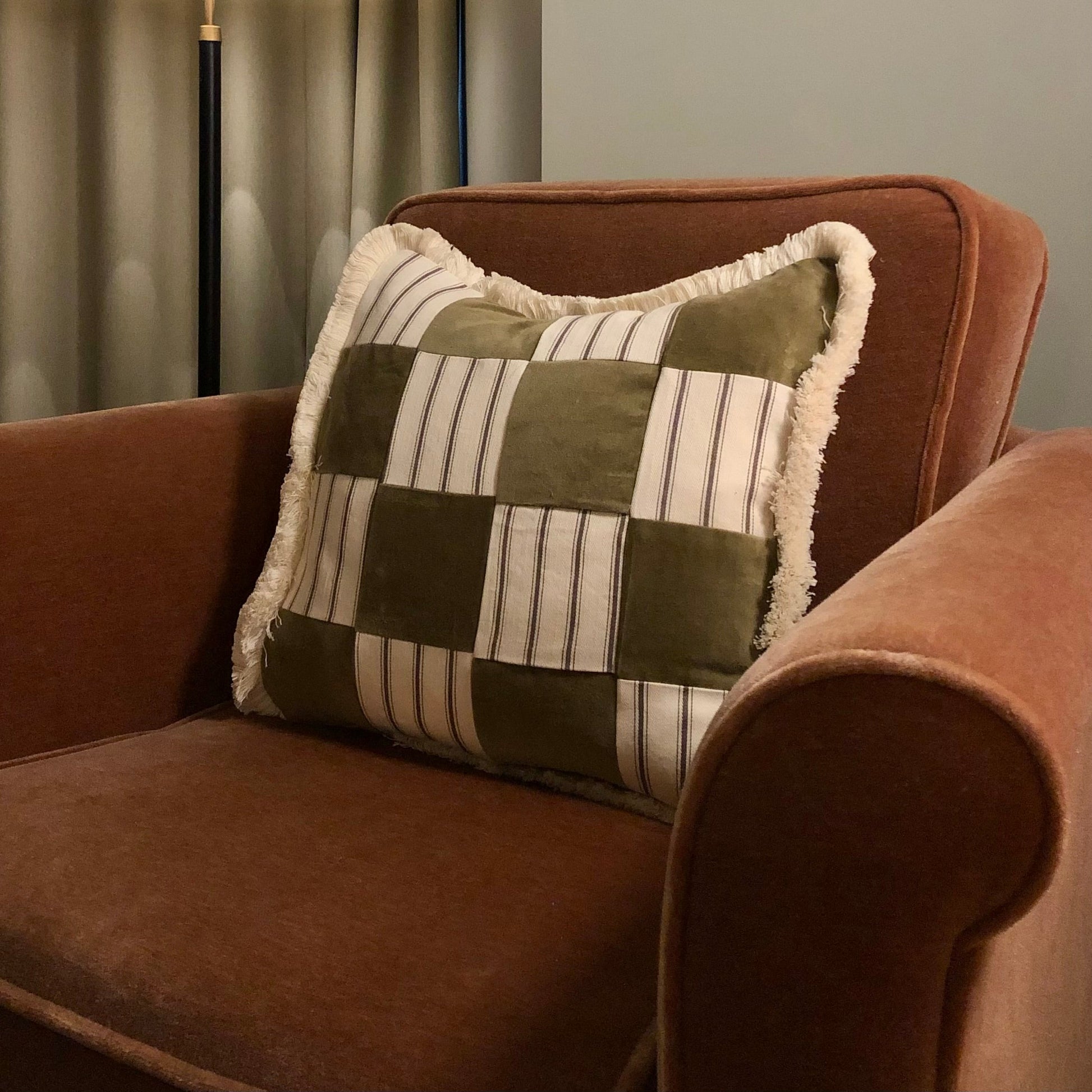 Limited edition, sustainably crafted patchwork cushion. These one-of-a-kind cushions have been handmade from reclaimed upholstery fabric in a timeless mix of olive cotton velvet and cotton ticking.