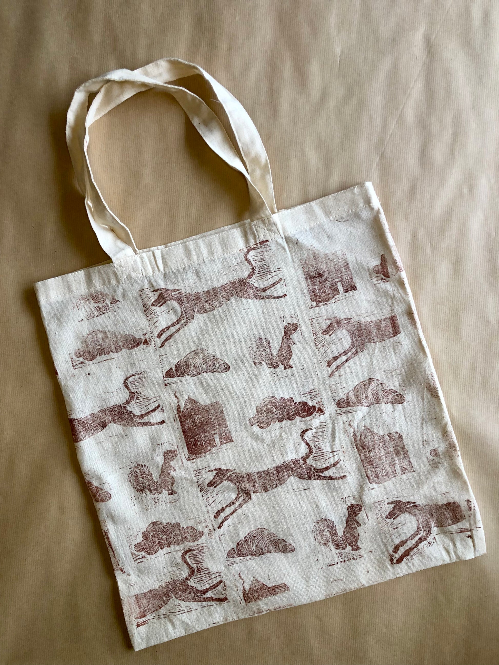 A hand-printed tote bag with all over "Squirrel Patrol" block print on both sides. This print is inspired by morning dog walks with my lurcher who loves to chase squirrels. Each piece is hand-printed in small batches and therefore all unique. Please allow 2 weeks for delivery.